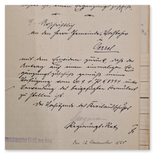 Daraufhin bat Lehrer Gebhardt Gemeindevorsteher Kohlmeyer dem Landrat die von ihm angeforderten Rechnungen zuzuschicken, was dieser gleich am nächsten Tag erledigte.