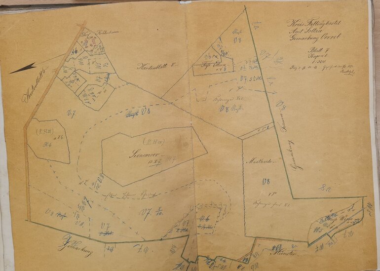 Auf den Kartenblättern sind die sauber geschriebenen Flurbezeichnungen gut zu lesen. Außerdem wurden die Namen der Bauern aus Oerrel, zu dessen Hof das jeweilige Grundstück gehörte, in Sütterlinschrift eingetragen. Die in blauer Schrift vorgenommen Eintragungen (Zahlen und Buchstaben) stammen von den Einschätzungsdeputierten, die bei der Einschätzung am 18.09.1872 hinzugefügt wurden. Dadurch sind einige Blätter für uns heute etwas unübersichtlich.