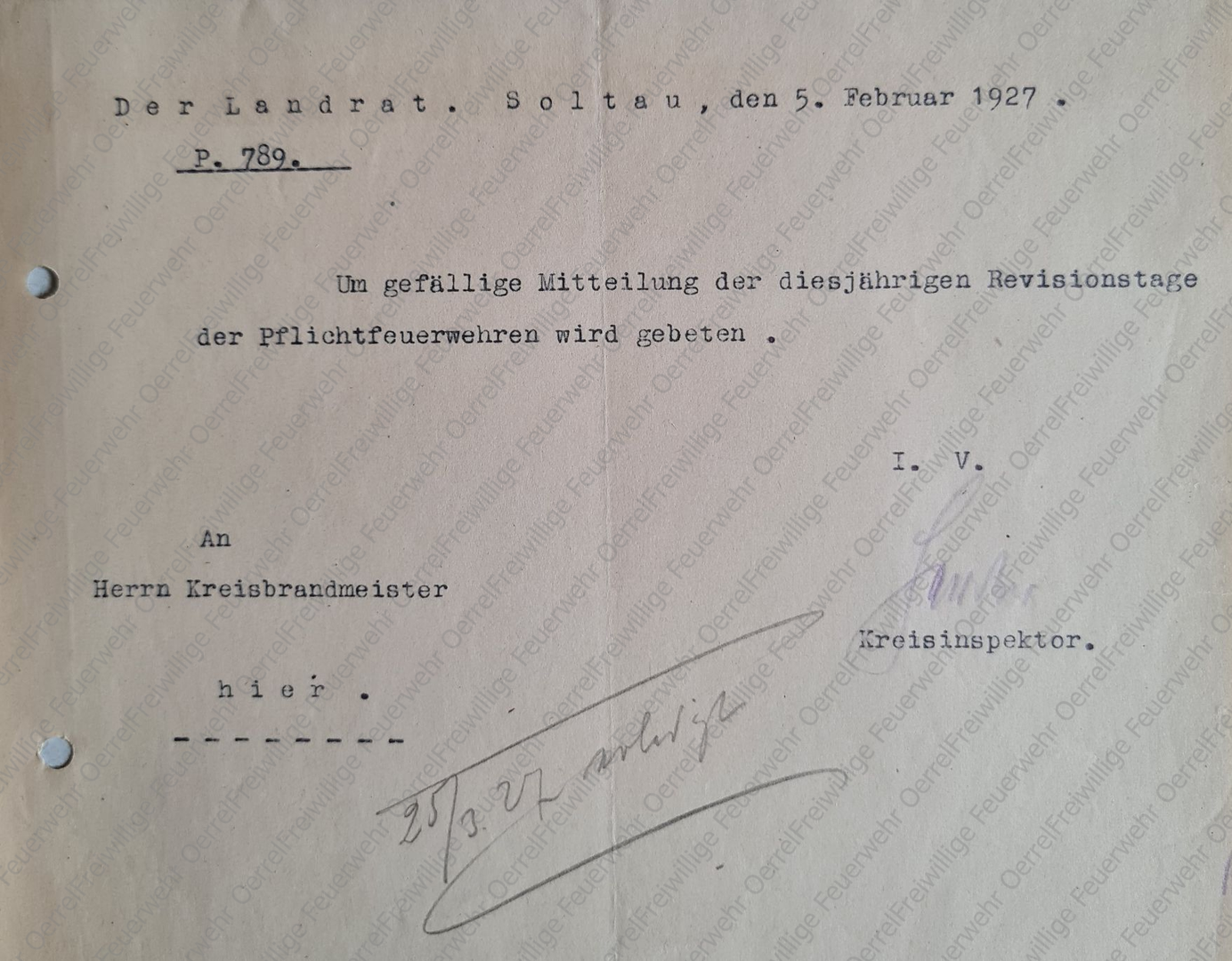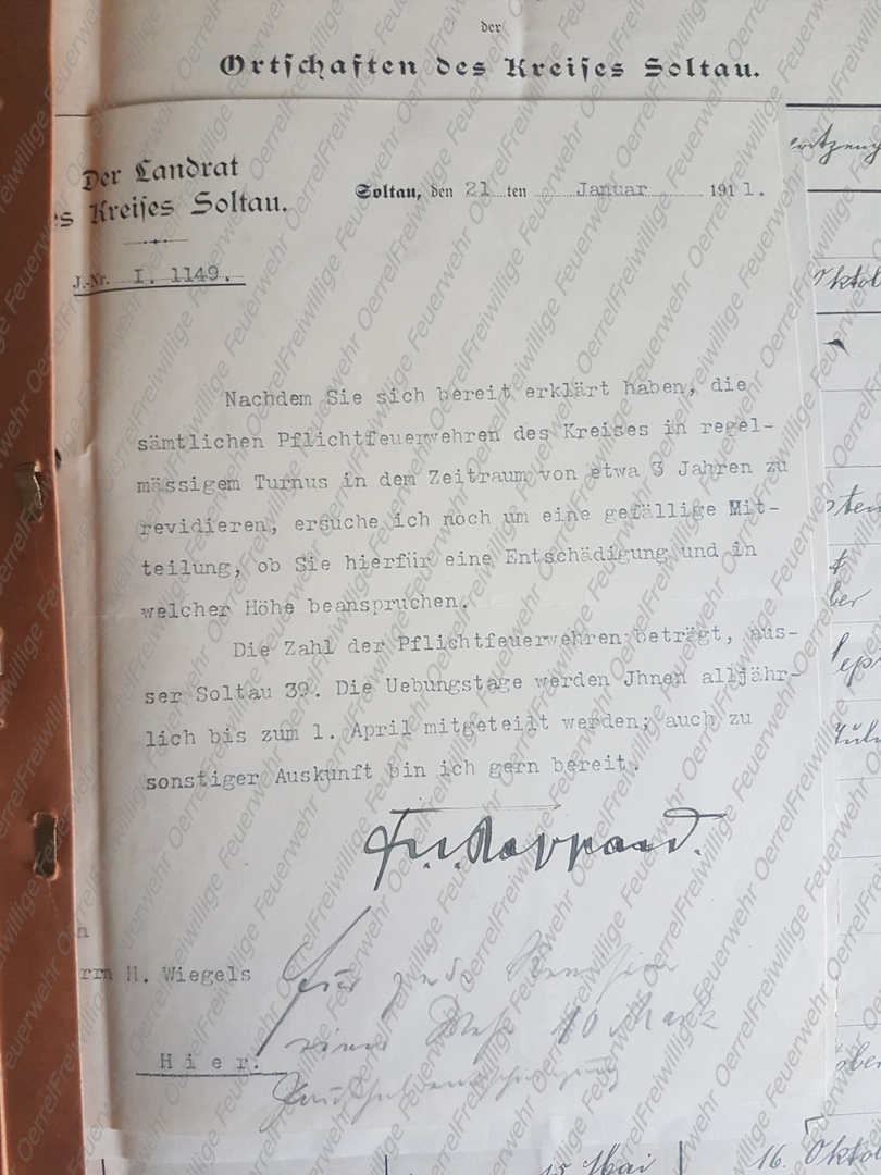 Am 21. Januar 1911 beauftragte der Landrat des Kreises Soltau, Herr Dr. von Rappard, den Kreisbrandmeister Heinrich Wiegels sämtliche Pflichtfeuerwehren im Kreis in regelmäßigen Abständen zu kontrollieren (revidiren).