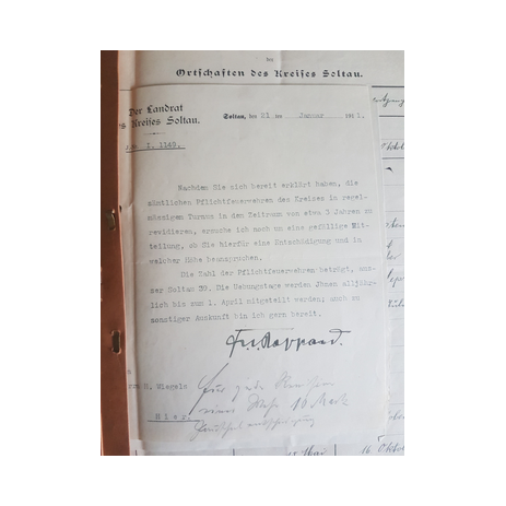 Diese Fundstücke stammen alle aus der Akte „Kreis-Brandmeister Correspondenz 1911 – 1927“ . Dabei handelt es sich um den Schriftverkehr im Zusammenhang mit der Pflichtfeuerwehr in Oerrel zwischen dem ersten Kreisbrandmeister im Kreis Soltau, Heinrich Wiegels, und dem damaligen Landrat in Soltau sowie mit dem Oerreler Gemeindevorsteher Haehn.