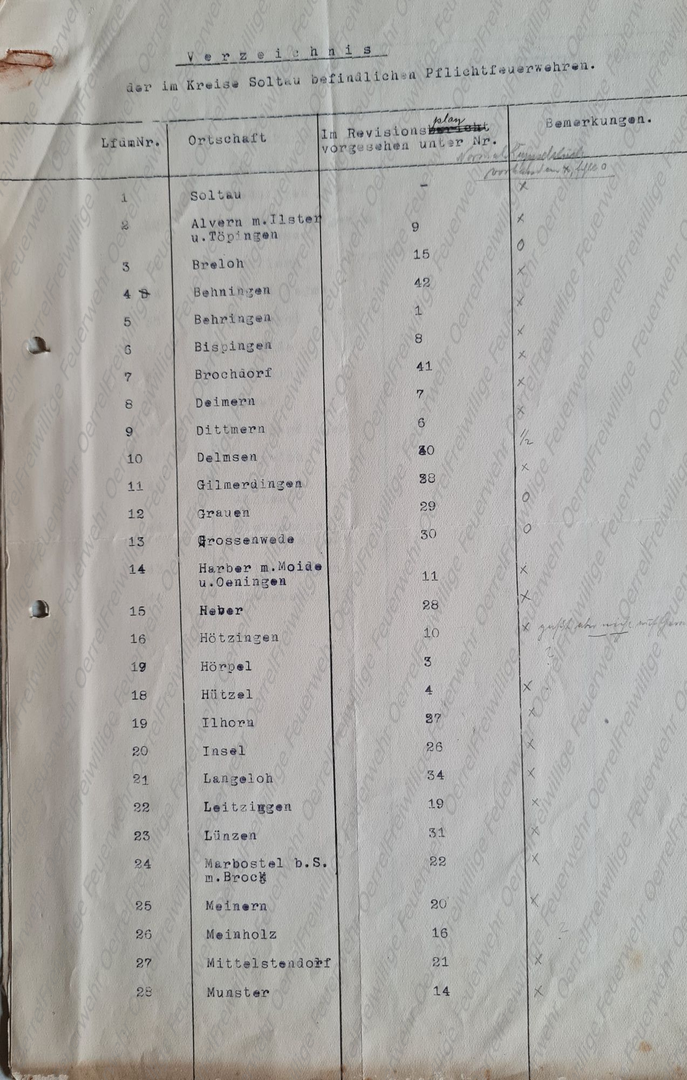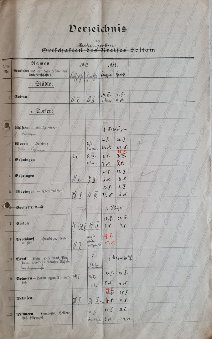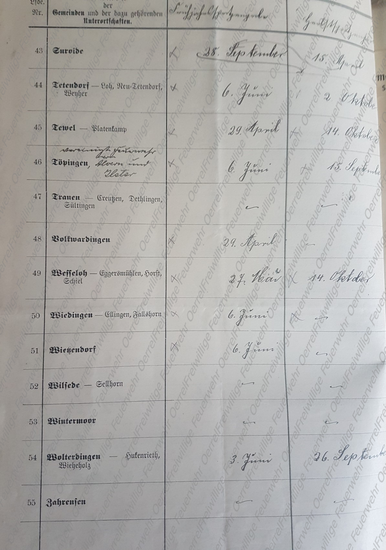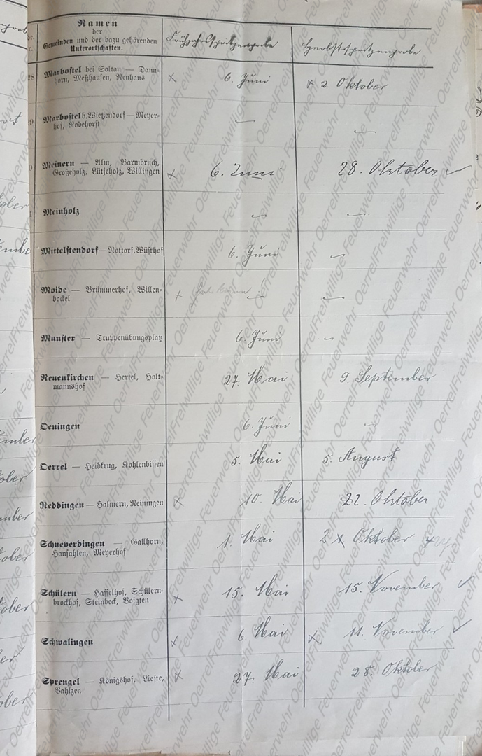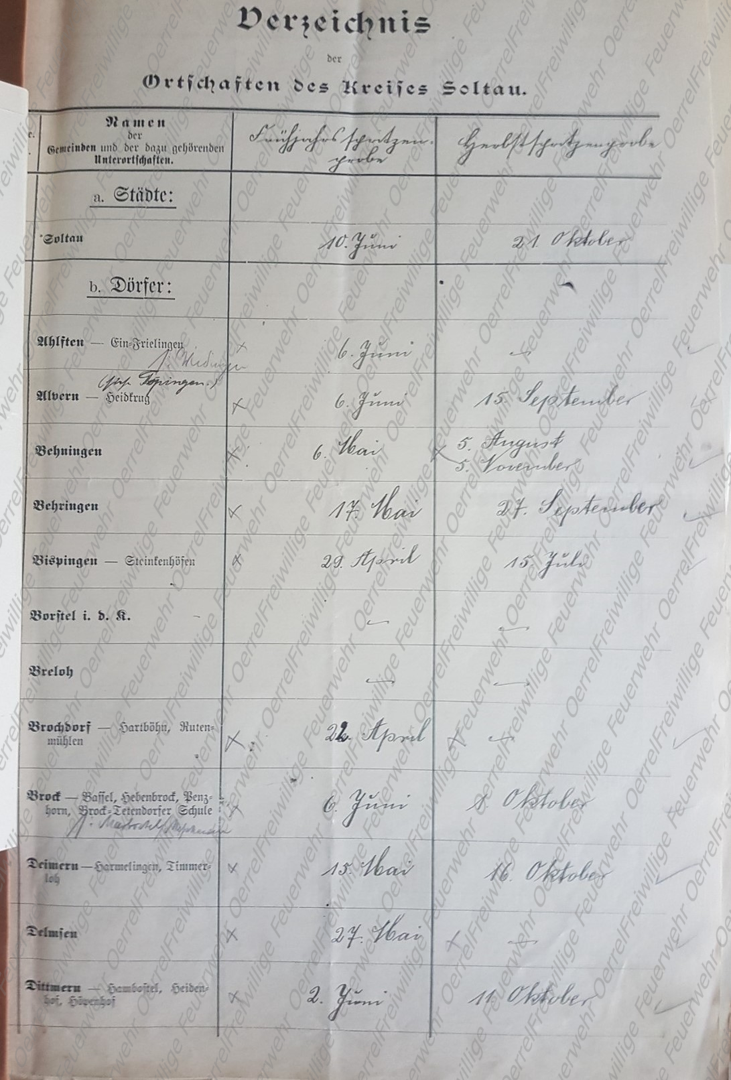 Am 19 Mai 1913 erhielt der Kreisbrandmeister vom Landrat den Plan mit den Terminen der für 1913 vorgesehenen Revisionen der Pflichtfeuerwehren im Kreis Soltau. Neben den halbjährlichen von allen Pflichtfeuerwehren durchzuführenden Spritzenproben für 1913 sind aus diesem Verzeichnis auch die Übungen des Vorjahres - 1912 – ersichtlich. Bei den in Rot eingetragenen Terminen, handelt es sich um diejenigen, bei denen der Kreisbrandmeister die Revision eingeplant hatte.