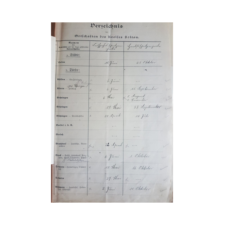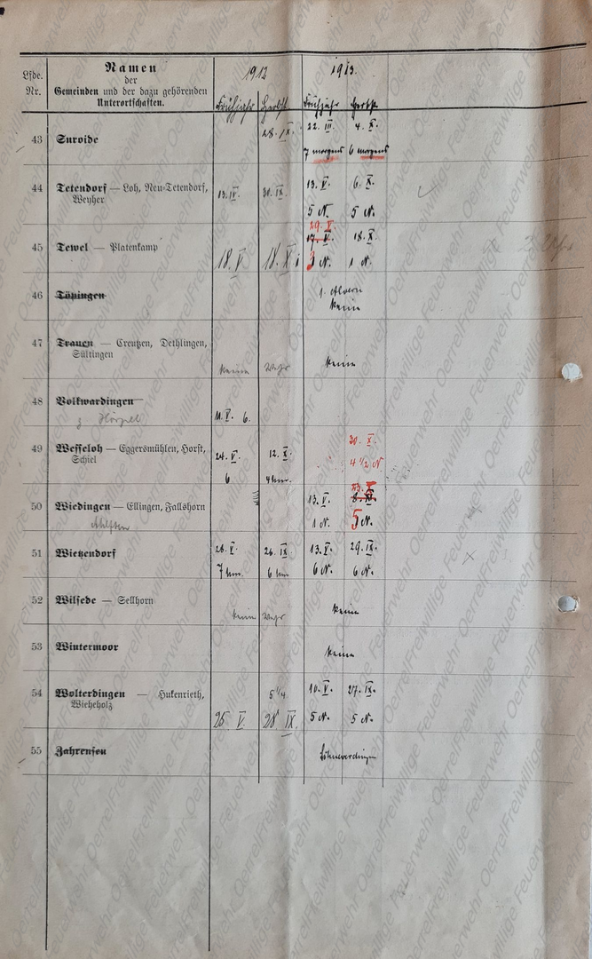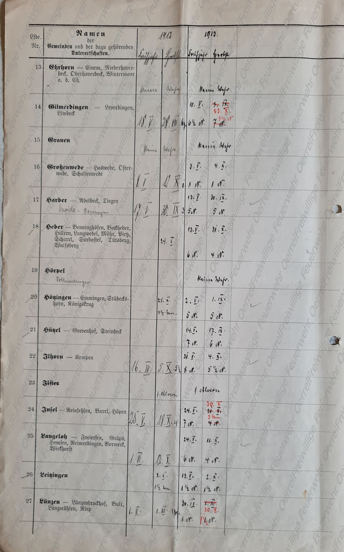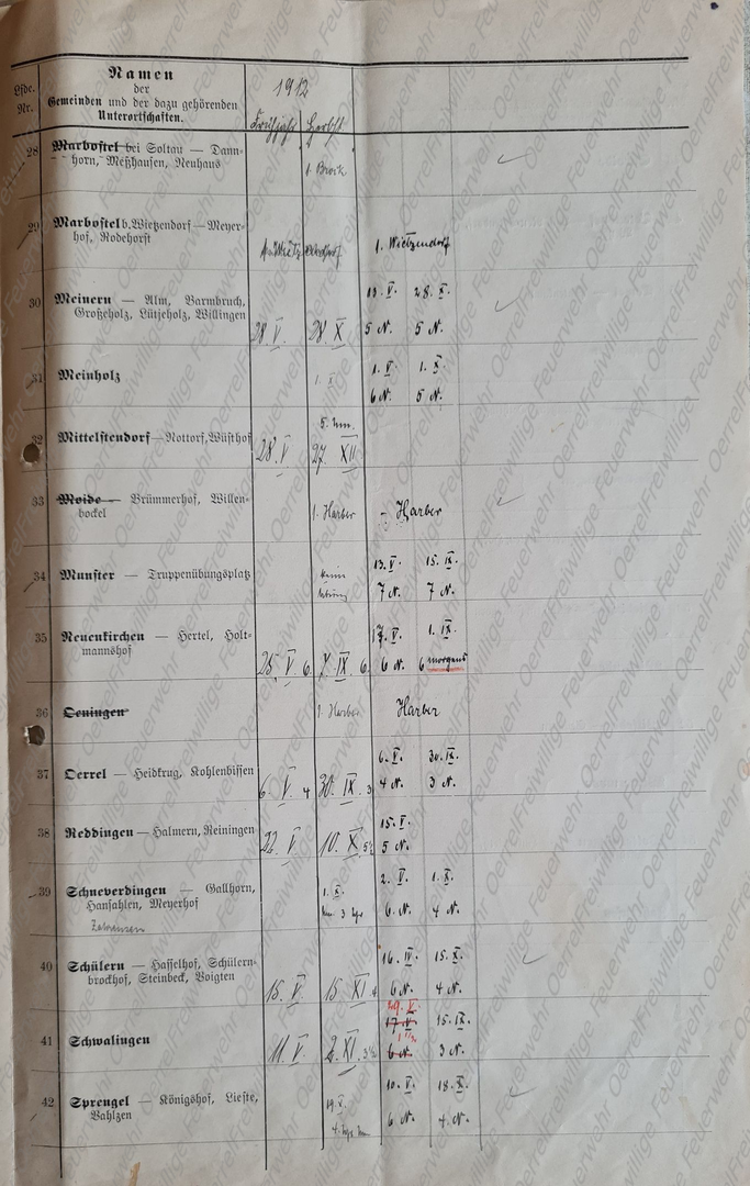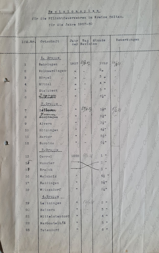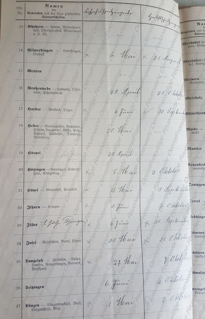 Am 19 Mai 1913 erhielt der Kreisbrandmeister vom Landrat den Plan mit den Terminen der für 1913 vorgesehenen Revisionen der Pflichtfeuerwehren im Kreis Soltau. Neben den halbjährlichen von allen Pflichtfeuerwehren durchzuführenden Spritzenproben für 1913 sind aus diesem Verzeichnis auch die Übungen des Vorjahres - 1912 – ersichtlich. Bei den in Rot eingetragenen Terminen, handelt es sich um diejenigen, bei denen der Kreisbrandmeister die Revision eingeplant hatte.