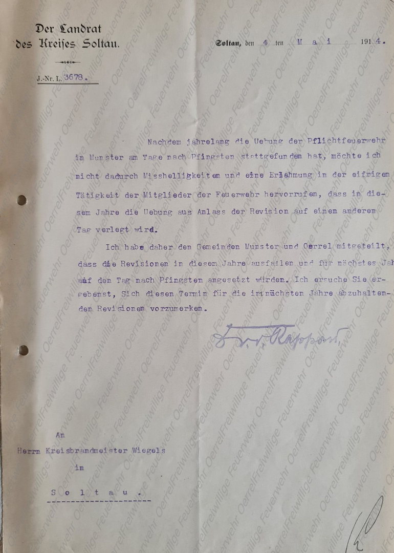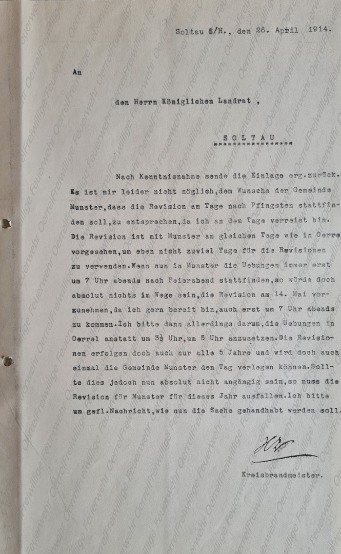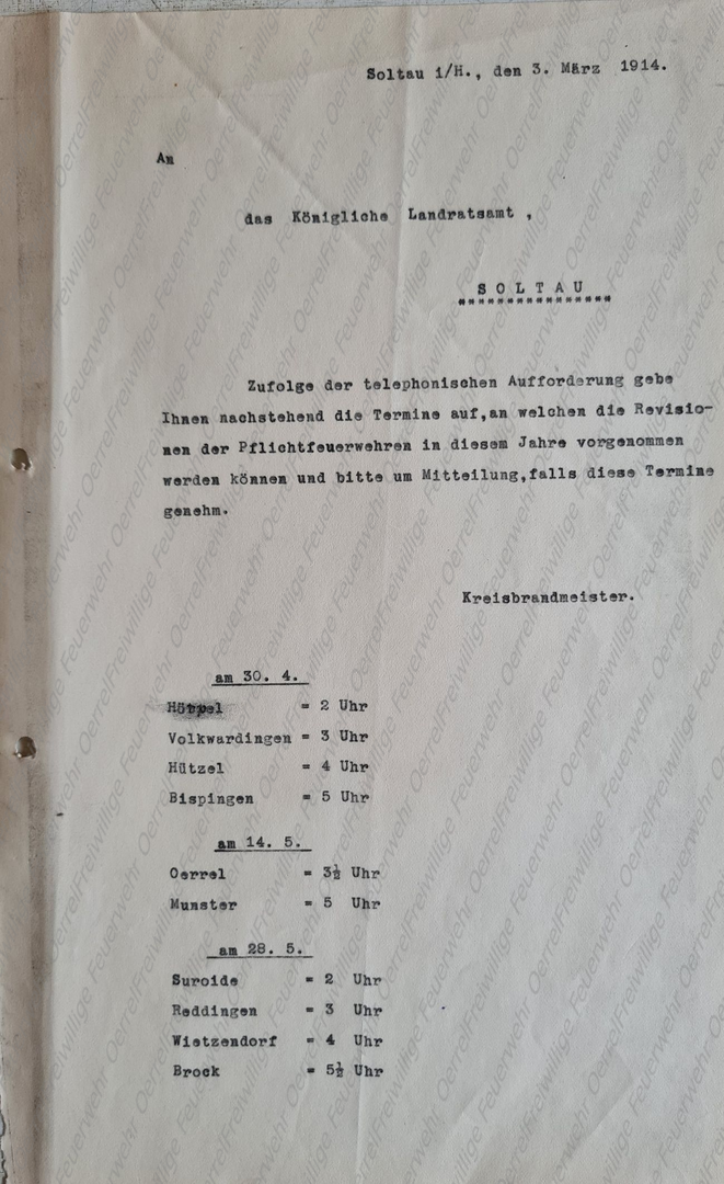 Mit Schreiben vom 3. März 1914 schlug der Kreisbrandmeister dem Landrat die Termine für die in diesem Jahr (1914) vorzunehmenden Überprüfungen der Pflichtfeuerwehren vor. Diese wurden ihm anscheinend so bestätigt, denn die Gemeinden wurden vom ihm entsprechend benachrichtigt. Allerdings mussten einige Termine wieder verschoben oder ganz abgesagt werden, so auch in Munster und dadurch auch in Oerrel. Dadurch fand in Oerrel vor dem 1. Weltkrieg keine Überprüfung der Pflichtfeuerwehr mehr statt.