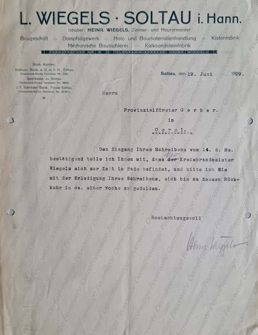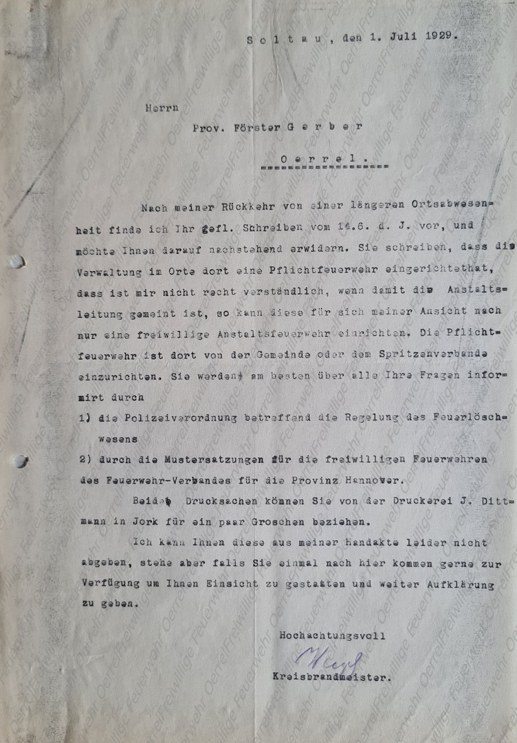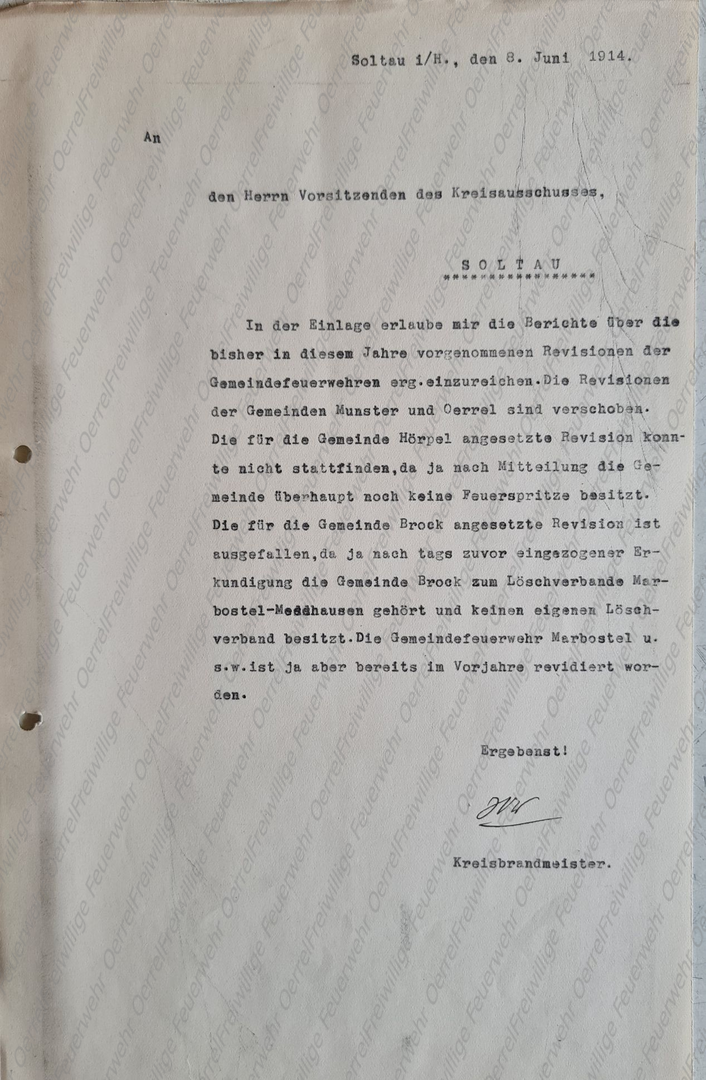 Mit dem Brief vom 18. August 1913 beantwortet Kreisbrandmeister Wiegels dem Landrat in Soltau eine ihm gestellt Anfrage, die dieser vom Ortsvorsteher in Oerrel erhalten hatte. Damals wurden die Anfragen mit den Antworten wieder zurück geschickt, so dass in der Akte meistens nur eine Durchschrift der Antwort zu finden ist.