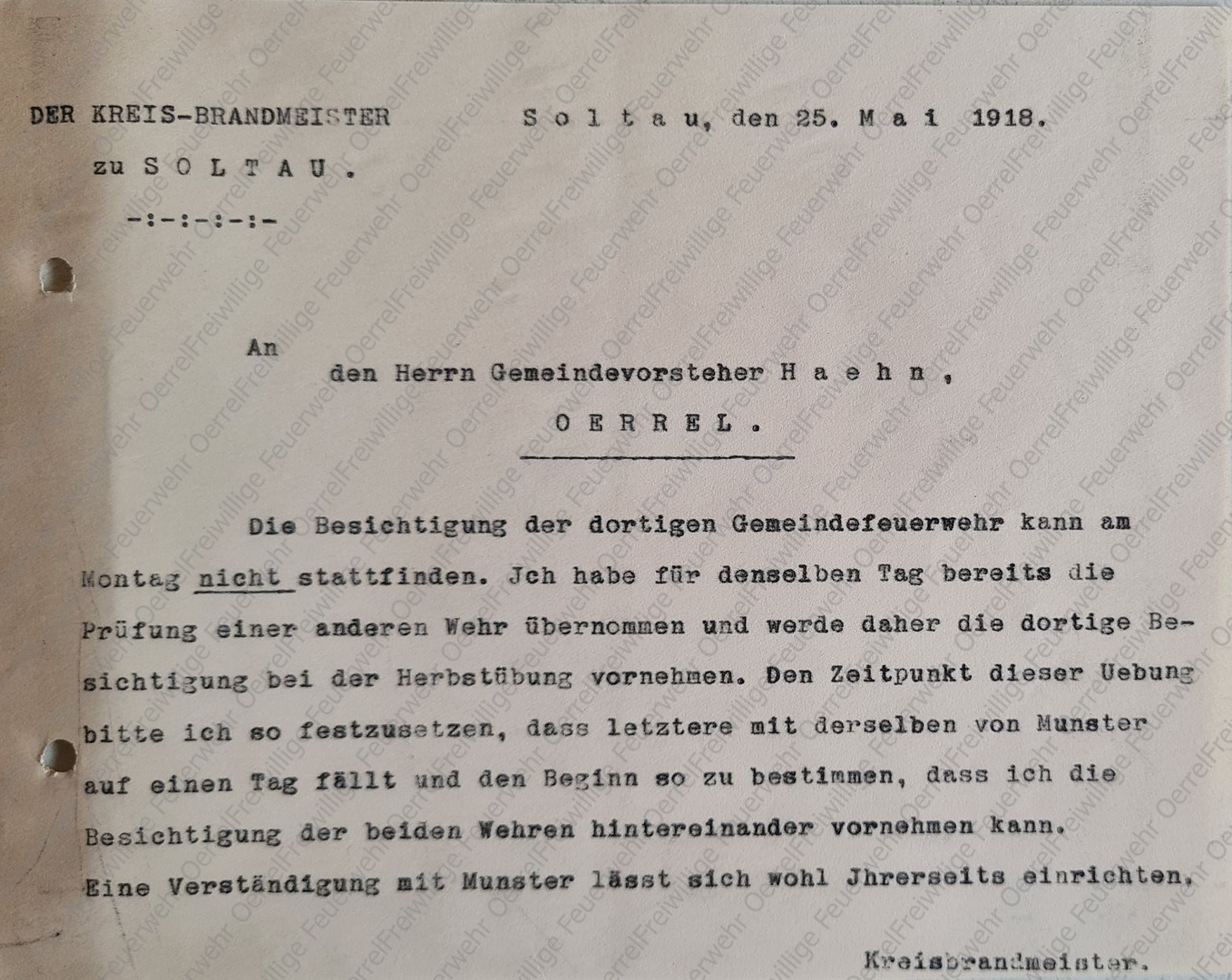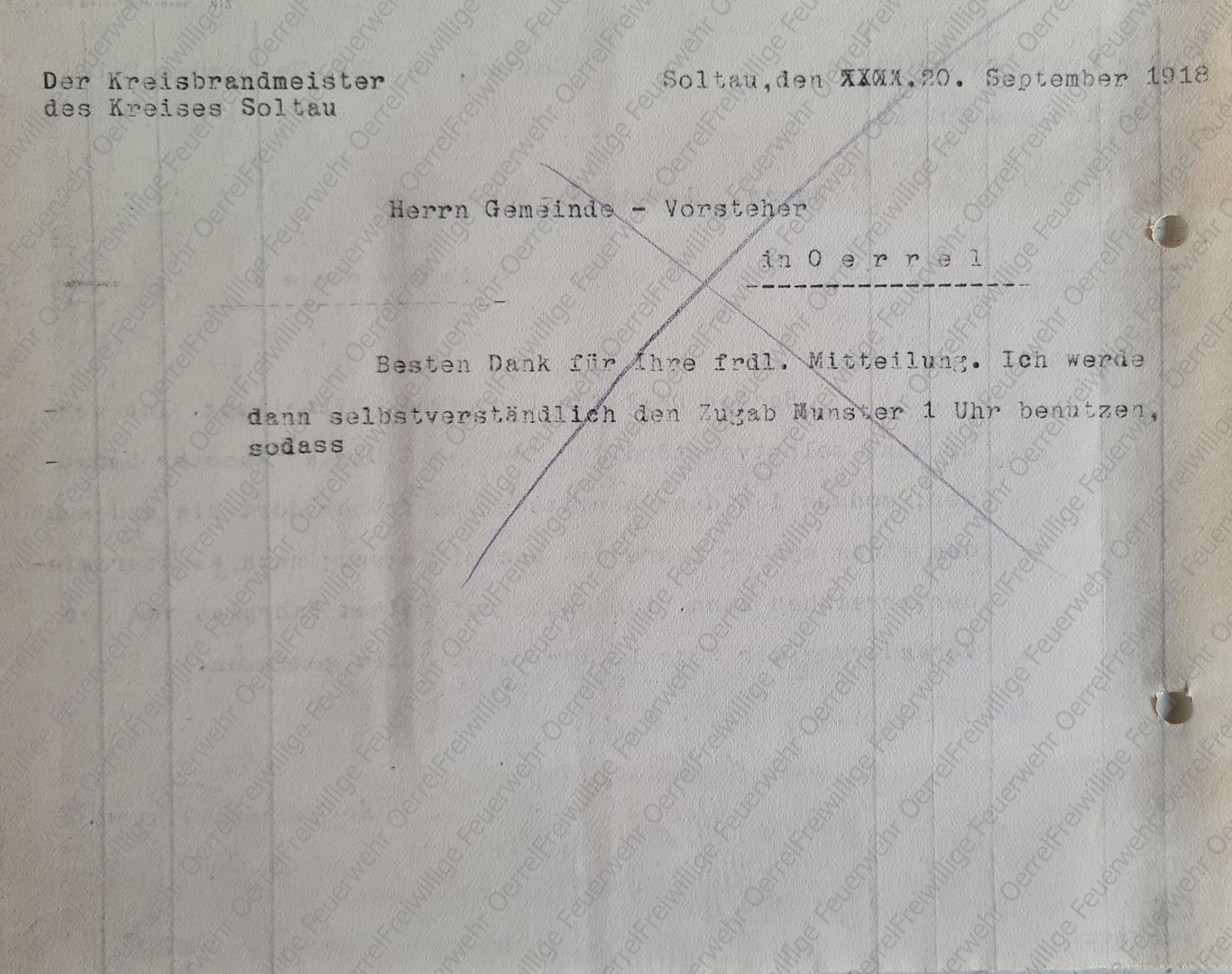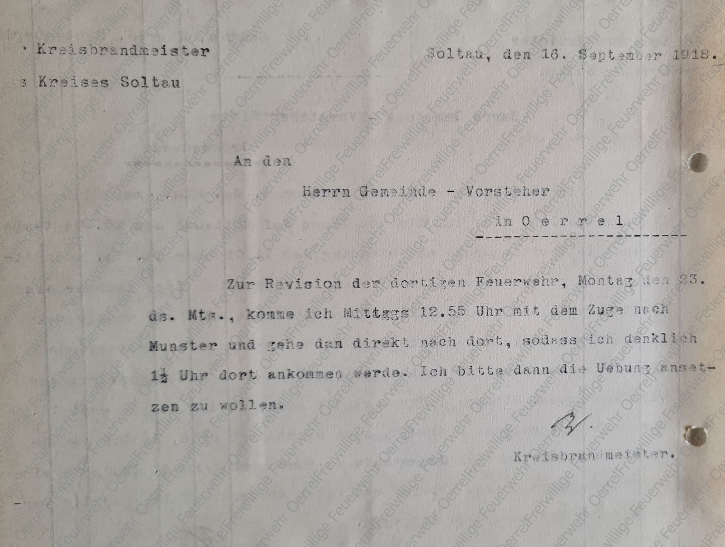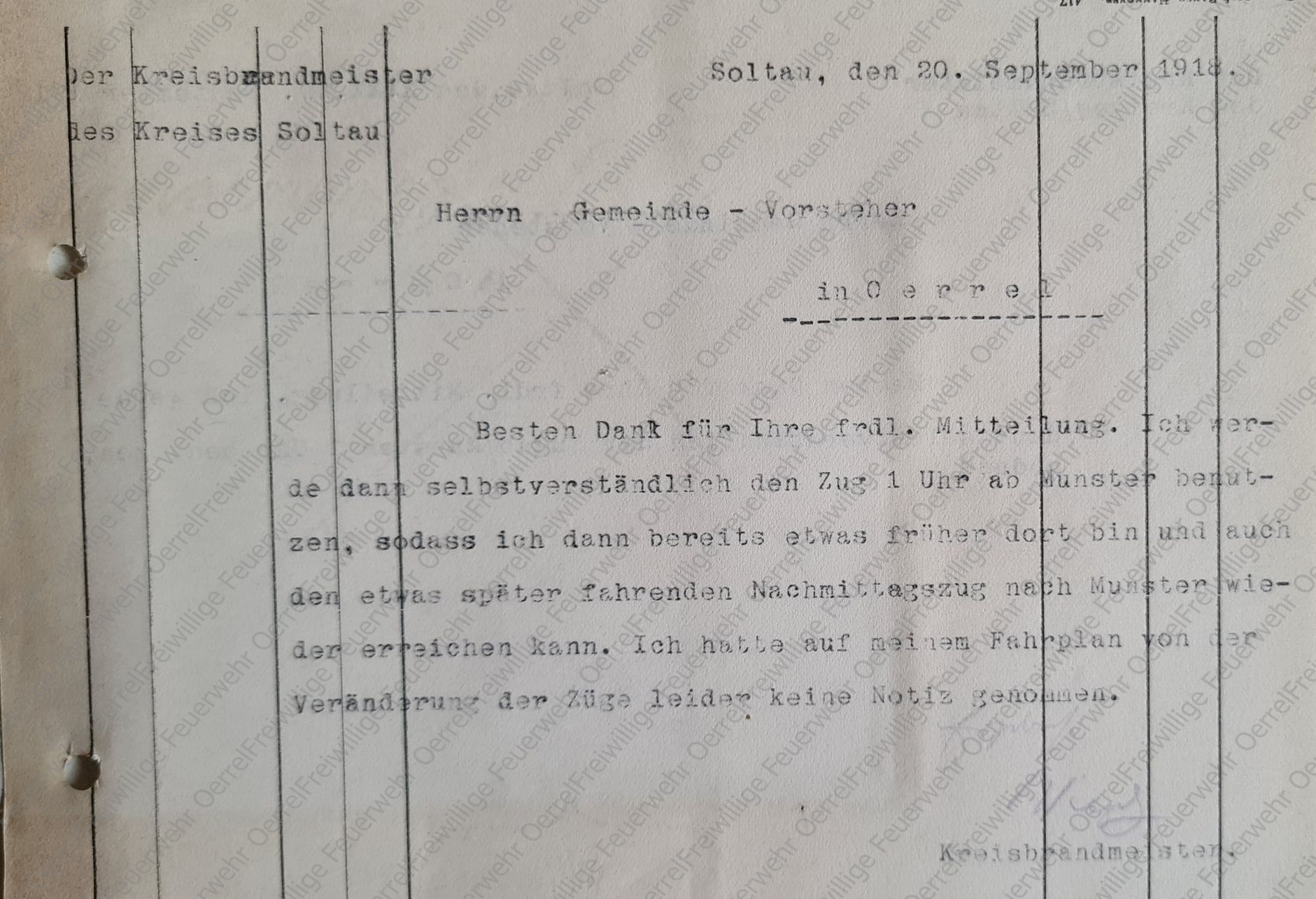 Oerrels Gemeindevorsteher Haehn wies den Kreisbrandmeister per Postkarte vom 17. September 1918 darauf hin, dass er von Munster aus mit der Kleinbahn weiter bis Dethlingen fahren könne, so dass er nicht die ganze Strecke von Munster bis Oerrel zu Fuß laufen müsse.