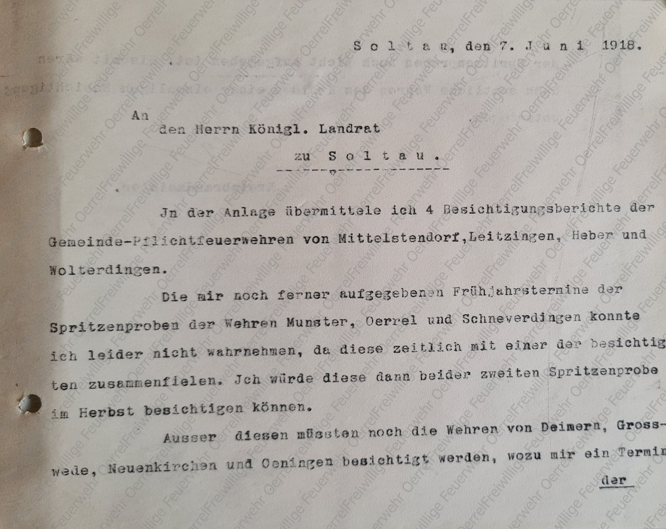 Am 9. August 1918 schrieb der KBM an die sechs Gemeinden, die er im Herbst 1918 für die Überprüfung vorgesehen hatte; da drunter waren Oerrel und Munster.