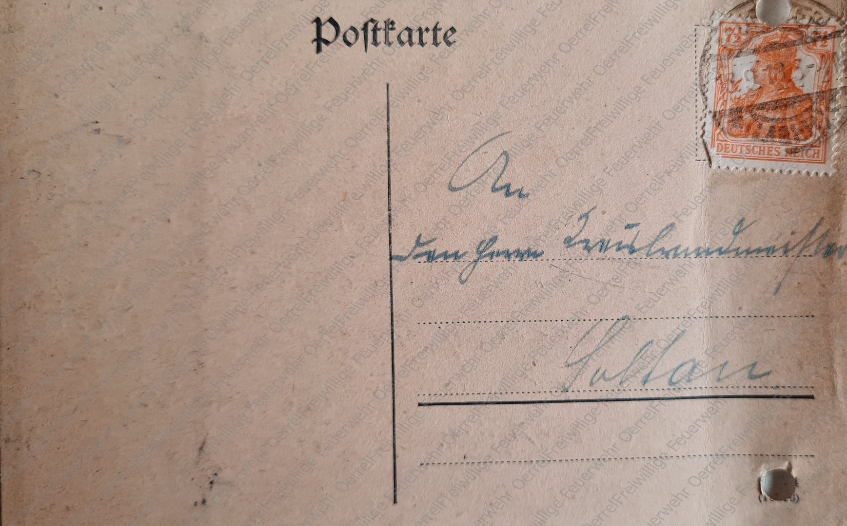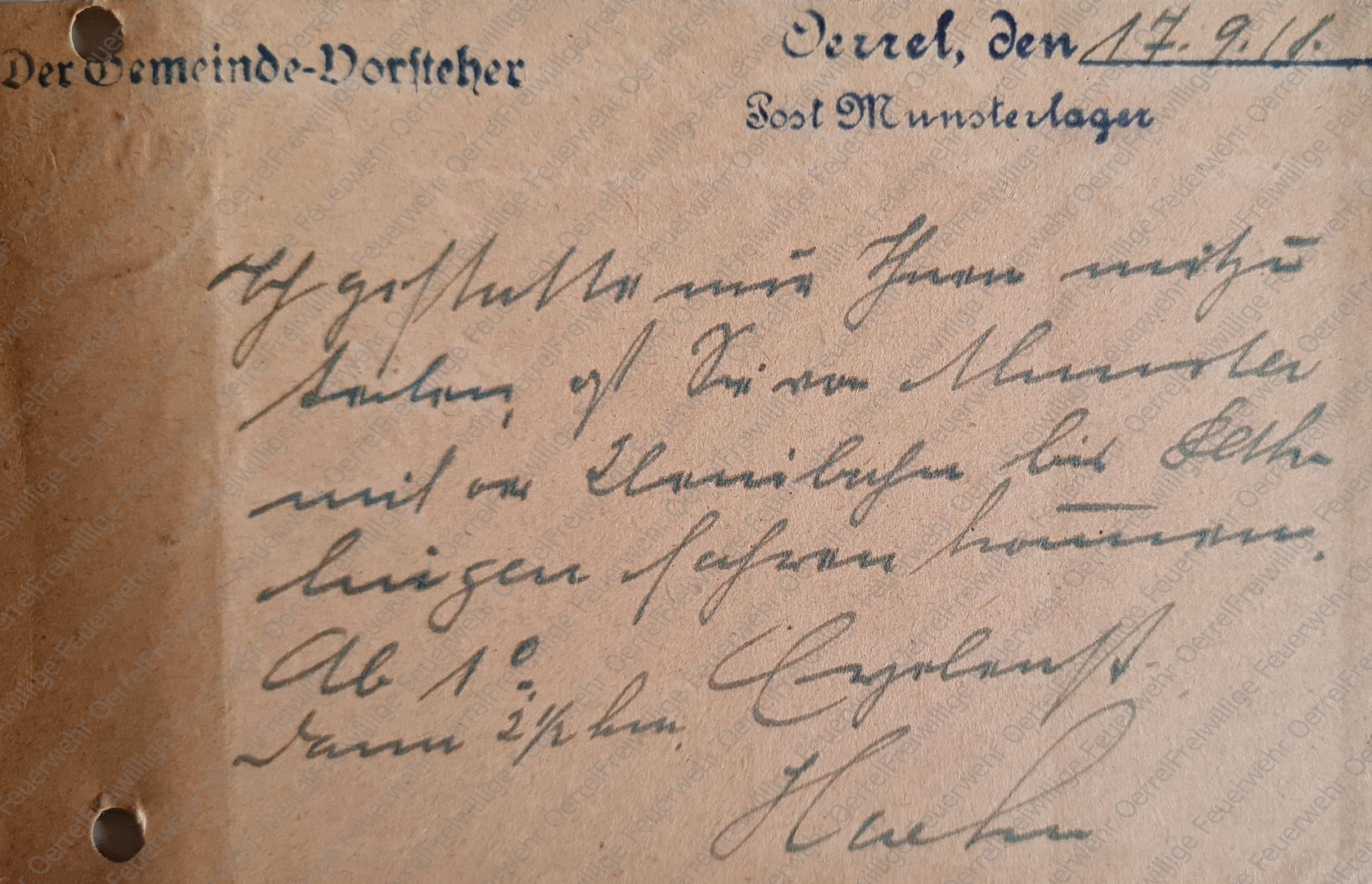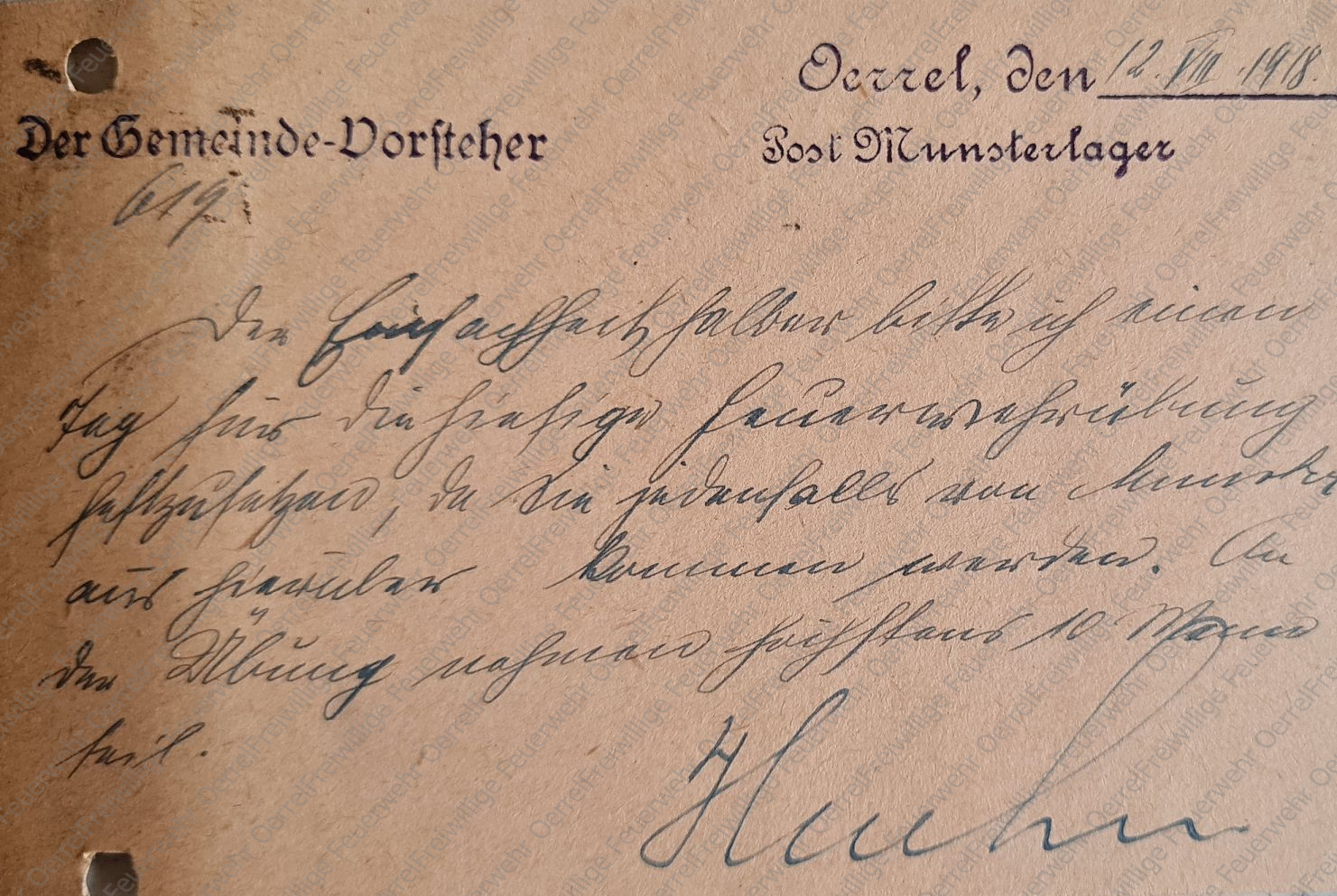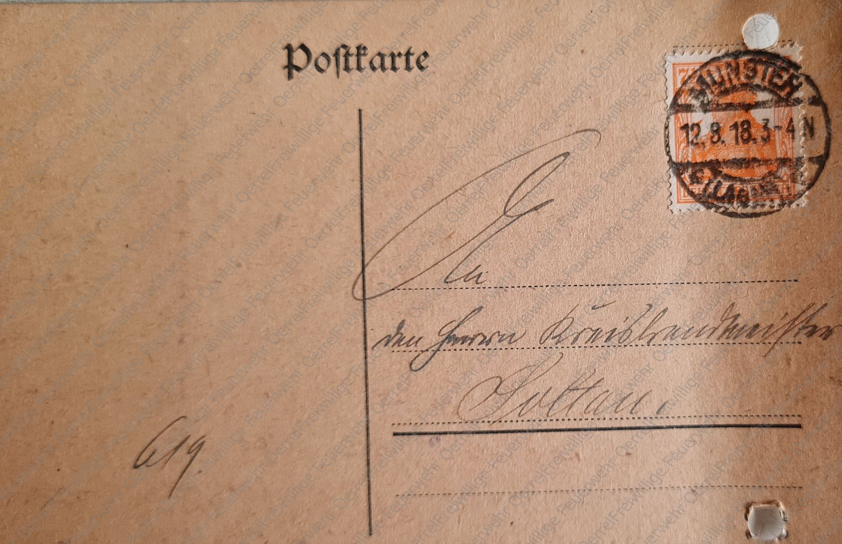 Die Postkarte des Gemeindevorstehers von Oerrel vom 12. August 1918 an den Kreisbrandmeister hat folgenden Wortlaut: