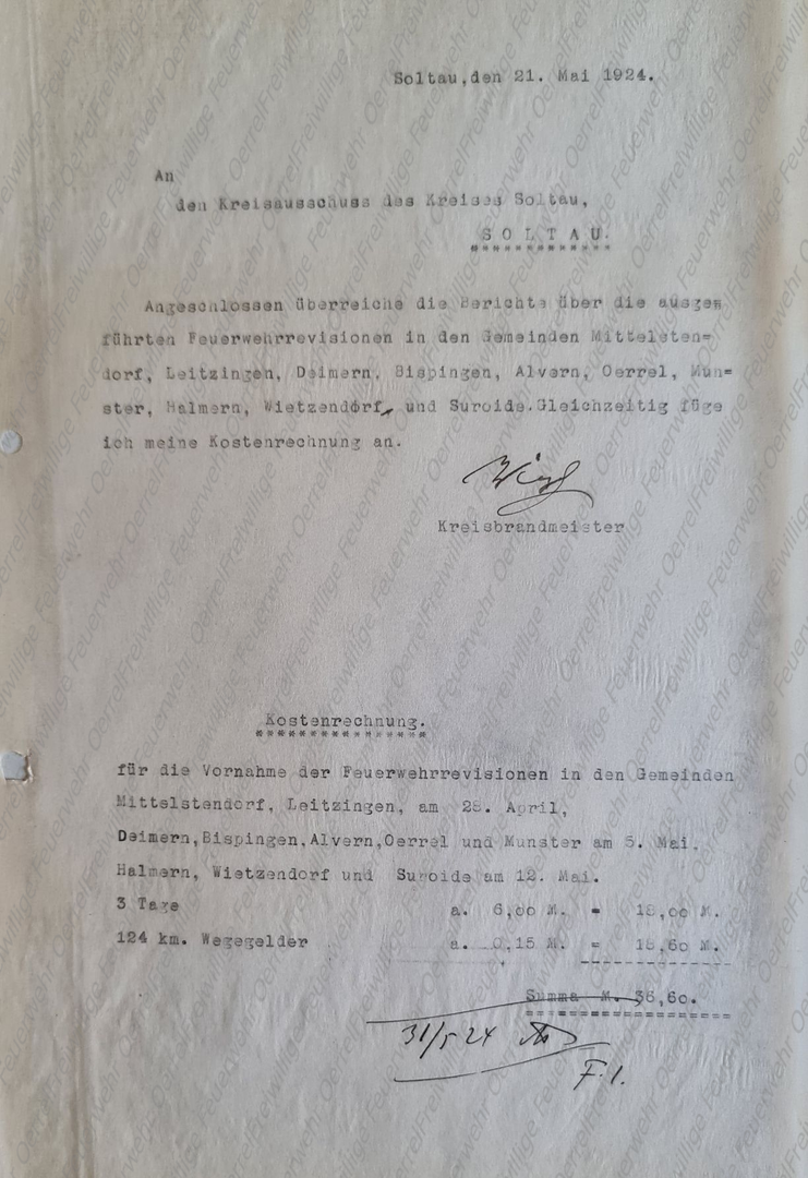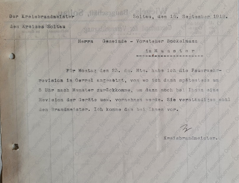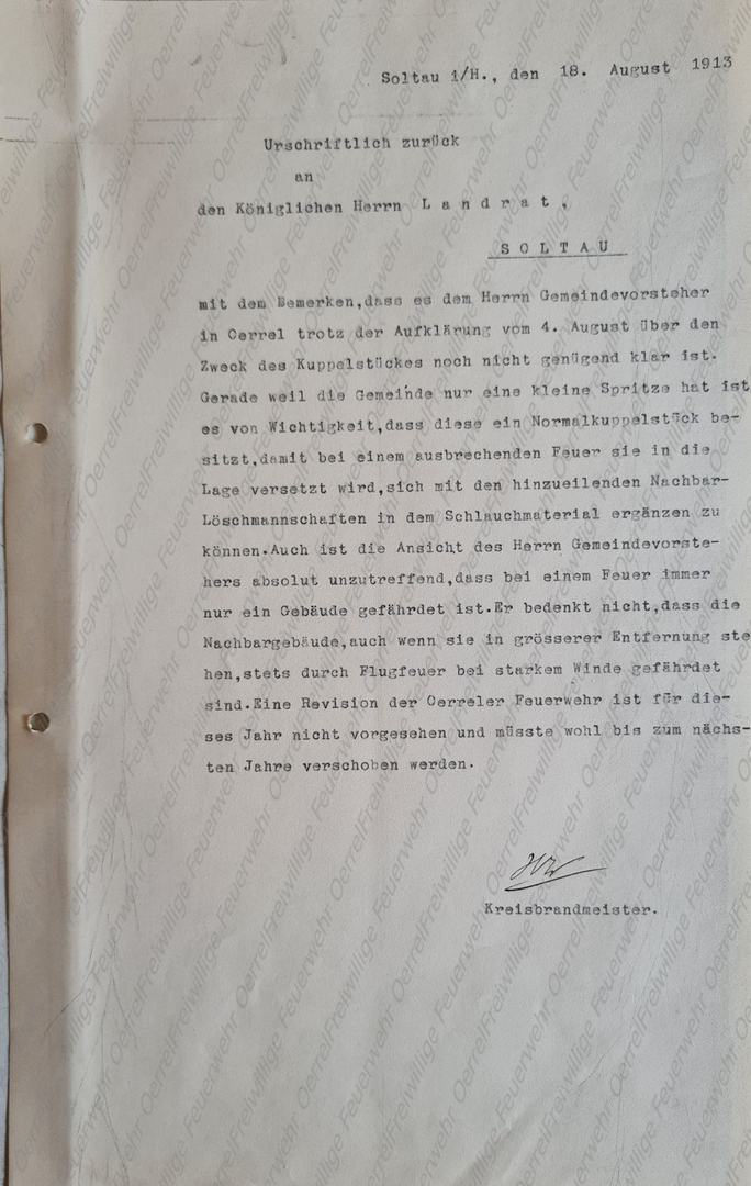 Am 18. August 1913 nahm der Kreisbrandmeister auf Anforderung des Landrates Stellung zu einem Schreiben des Ortsvorstehers aus Oerrel, in dem dieser den Sinn und Zweck der Beschaffung eines Normalkuppelstücks für die in Oerrel vorhandene kleine Spritze in Frage stellte. Das Schreiben des Oerreler Ortsvorstehers liegt allerdings nicht vor.