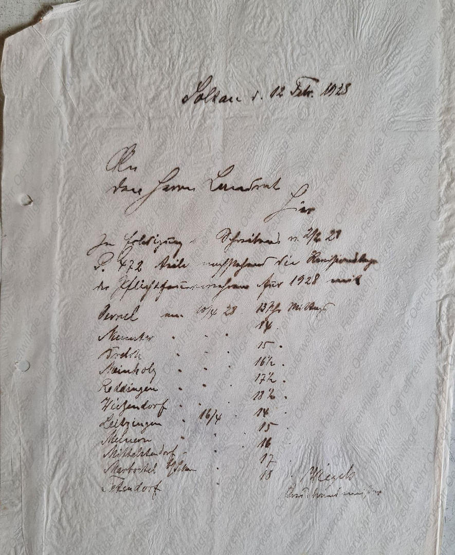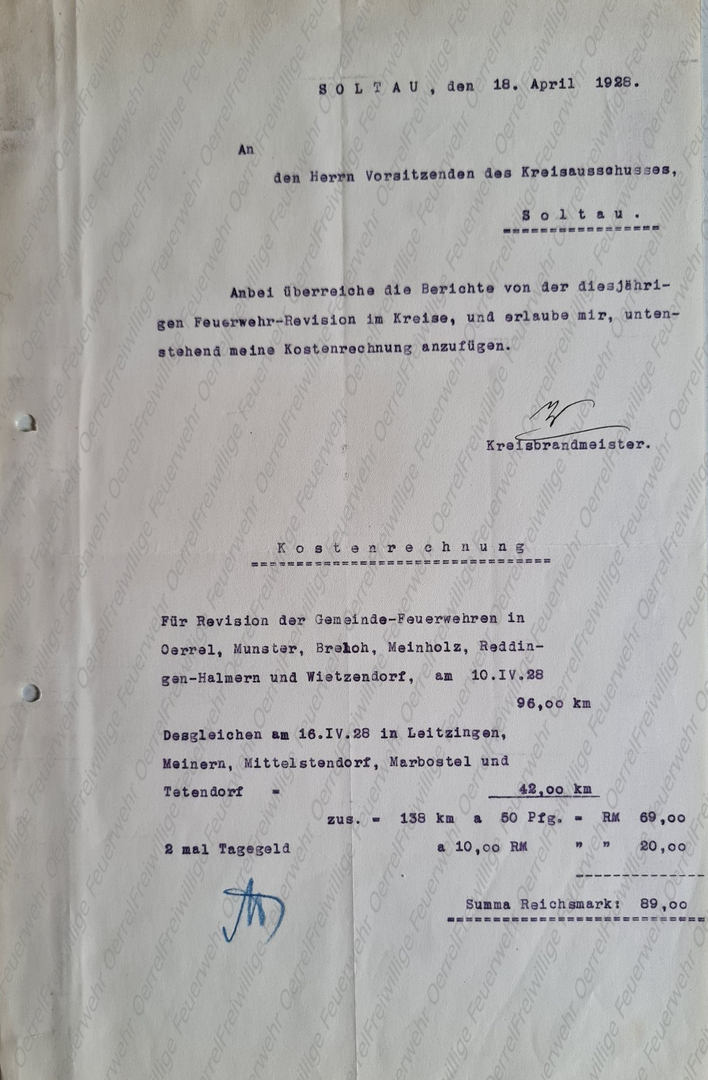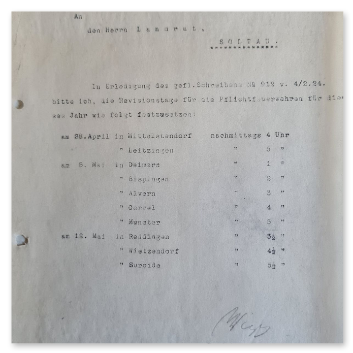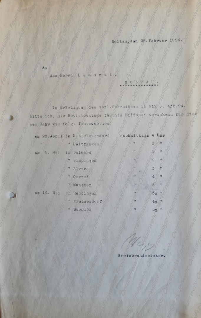 In Erledigung Ihres Schreibens vom 2./2.1928 - P. 472 - teile (ich) nachstehend die Revisionstage der Pflichtfeuerwehren für 1928 mit. Hier zusammengefasst: 10.4.28 = Oerrel, Munster, Breloh, Meinholz, Reddingen, Wietzendorf (Uhrzeit steht jeweils dahinter) 16.4.28 = Leitzingen, Meinern, Mittelstendorf, Marbostel bei Soltau, Tetendorf (Uhrzeit steht jeweils dahinter). Wiegels, Kreisbrandmeister