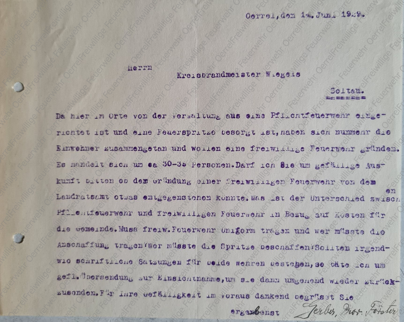 Die nachfolgenden Fundstücke über die Pflichtfeuerwehr in Oerrel stammen aus der Akte des damaligen Kreisbrandmeisters Heinrich Wiegels (KBM von 1911 bis 1933). Diese historische Akte ist komplett im „Feuerwehr-Museum Heidekreis“ unter „Der Soltauer Kreisbrandmeister“ ausgestellt. Dort werden neben weiteren Dokumenten auch die Hintergründe und Zusammenhänge erläutert.