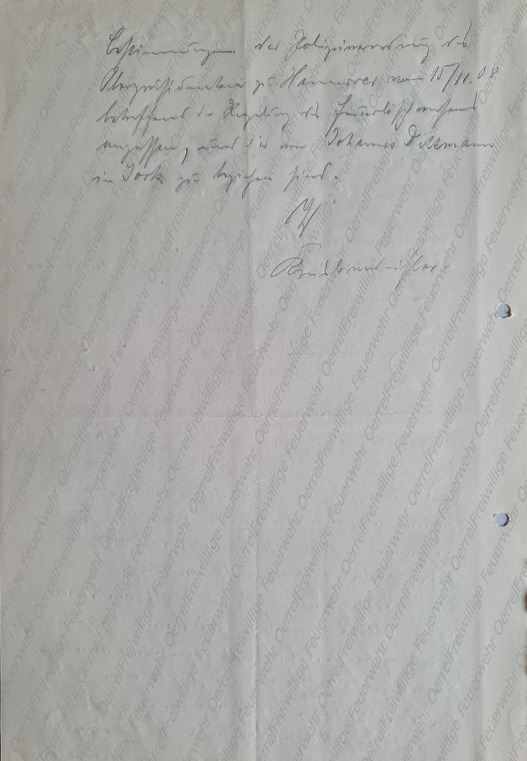 Wenn eine anzuerkennende Freiwillige Feuerwehr gegründet werden soll, so muß das Prinzip der Freiwilligkeit auch gewahrt werden. Was hier geplant ist, ist ja nichts weiter wie eine Pflichtfeuerwehr, wofür eine Dienstanweisung herausgegeben wird. Will man eine wirkliche Freiwillige Feuerwehr gründen, so soll man sich auch den dazugehörigen Richtlinien anpassen. Es sind hierzu Muster-Satzungen vom Provinzial-Feuerwehrband herausgegeben, die sich nach den Bestimmungen der Polizeiverordnung des Oberpräsidenten zu Hannover vom 15./11. 1908 betreffend der Regelung des Feuerlöschwesens anpassen, und die von Johannes Dittmann in Jork zu beziehen sind.
